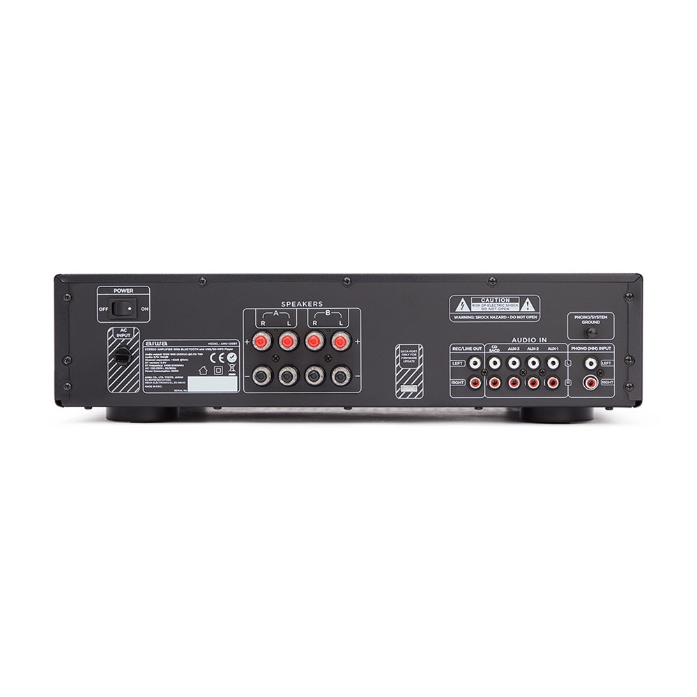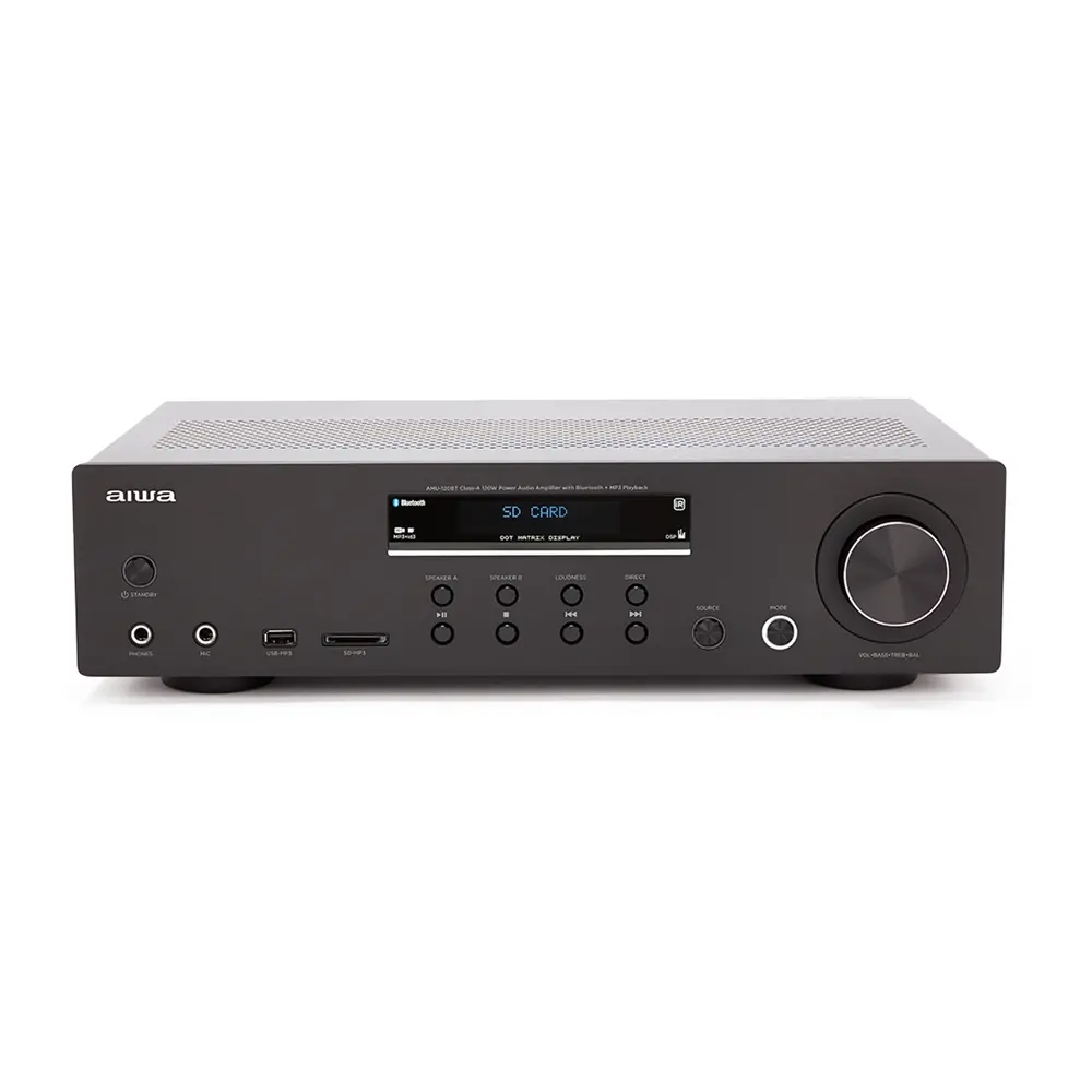 Amplificatore stereo compatto Aiwa AMU-120 BT BK con connettività Bluetooth integrata, ideale per impianti audio domestici e installazioni di piccole e medie dimensioni, progettato per offrire semplicità d’uso, versatilità e qualità sonora affidabile.