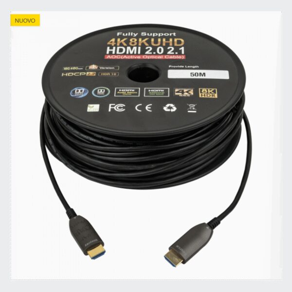 Cavo HDMI 2.0 in fibra ottica da 30 metri per trasmissioni 4K Ultra HD senza perdita di segnale. Perfetto per installazioni professionali, lunghe tratte e connessioni tra proiettori, display e sorgenti AV di alta qualità.