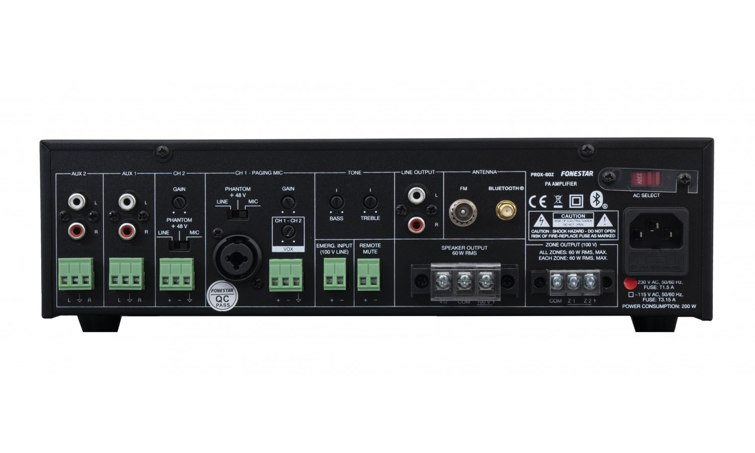 Amplificatore compatto da 60W con gestione 2 zone, Bluetooth, porta USB e radio FM integrata. Ideale per negozi, uffici, bar, ambienti commerciali e diffusione sonora multiambiente.