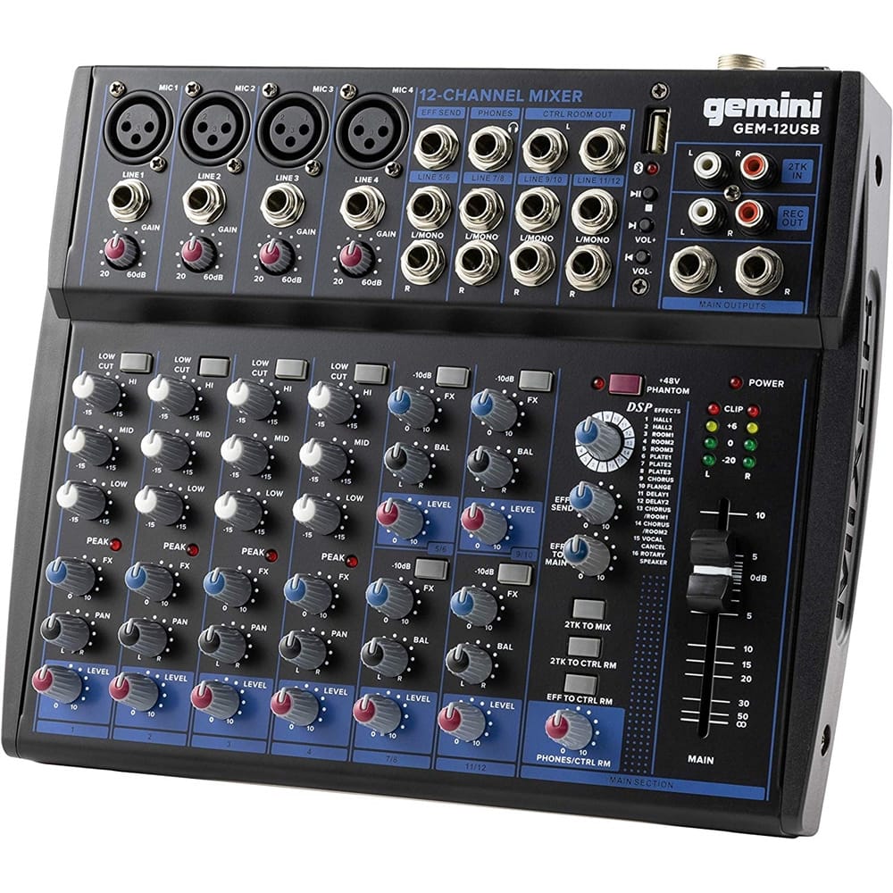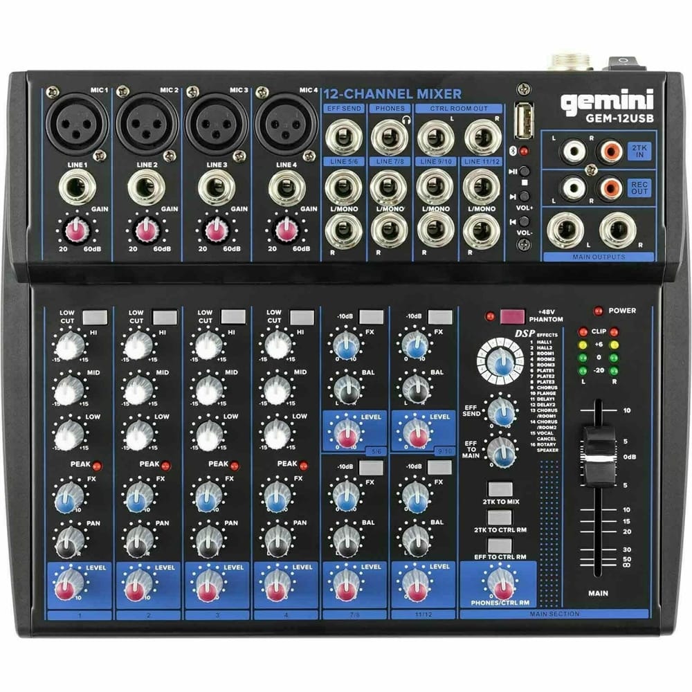 Il Gemini GEM-12USB è un mixer analogico a 12 canali con funzioni moderne come streaming Bluetooth, player USB integrato ed effetti digitali. Ideale per live, podcast, eventi e studi, unisce versatilità, qualità audio e facilità d’uso.
