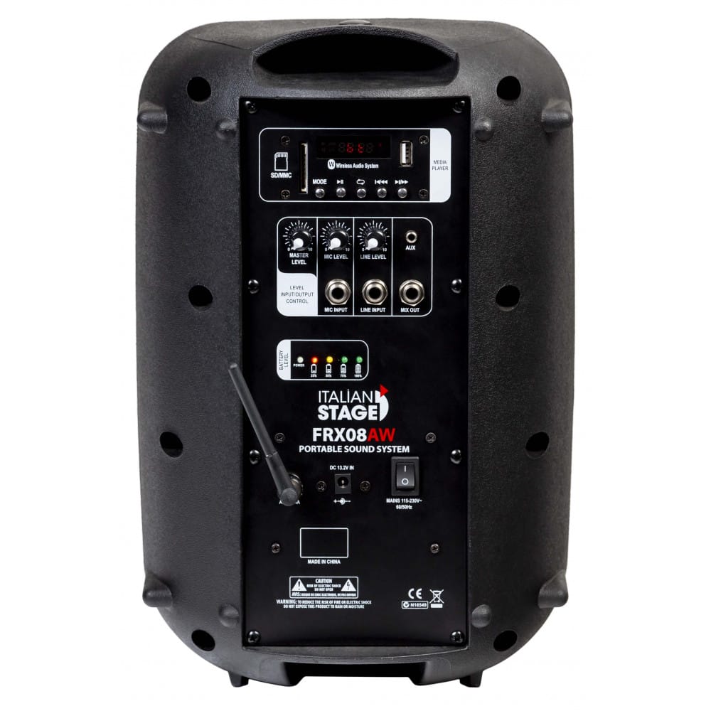 L’Italian Stage IS FRX08AW è un diffusore portatile che unisce potenza e praticità, perfetto per eventi, conferenze, animazione e piccoli live. Grazie alla batteria interna ricaricabile, puoi usarlo ovunque senza preoccuparti delle prese di corrente. Integra un lettore MP3 con USB e SD, connettività Bluetooth per lo streaming audio e include un microfono wireless VHF per iniziare subito a lavorare. Con woofer da 8″, driver a tromba da 1″ e amplificazione in Classe D da 30 W RMS (60 W di picco), garantisce un suono chiaro, potente e sempre pronto all’uso.