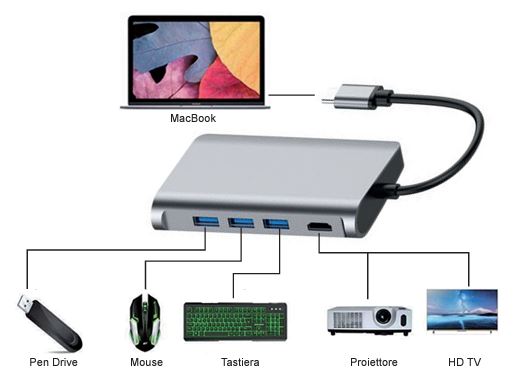 ADATTATORE MULTIPORTA 8 IN 1 da USB TIPO C ad HDMI 4K+3XUSB 3.0+USB-C+RJ45+SD/MICRO SD