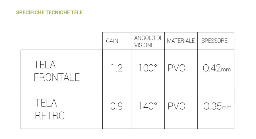 Composto da cornice, stativi, una tela frontale e su richiesta una tela retroproiettabile.