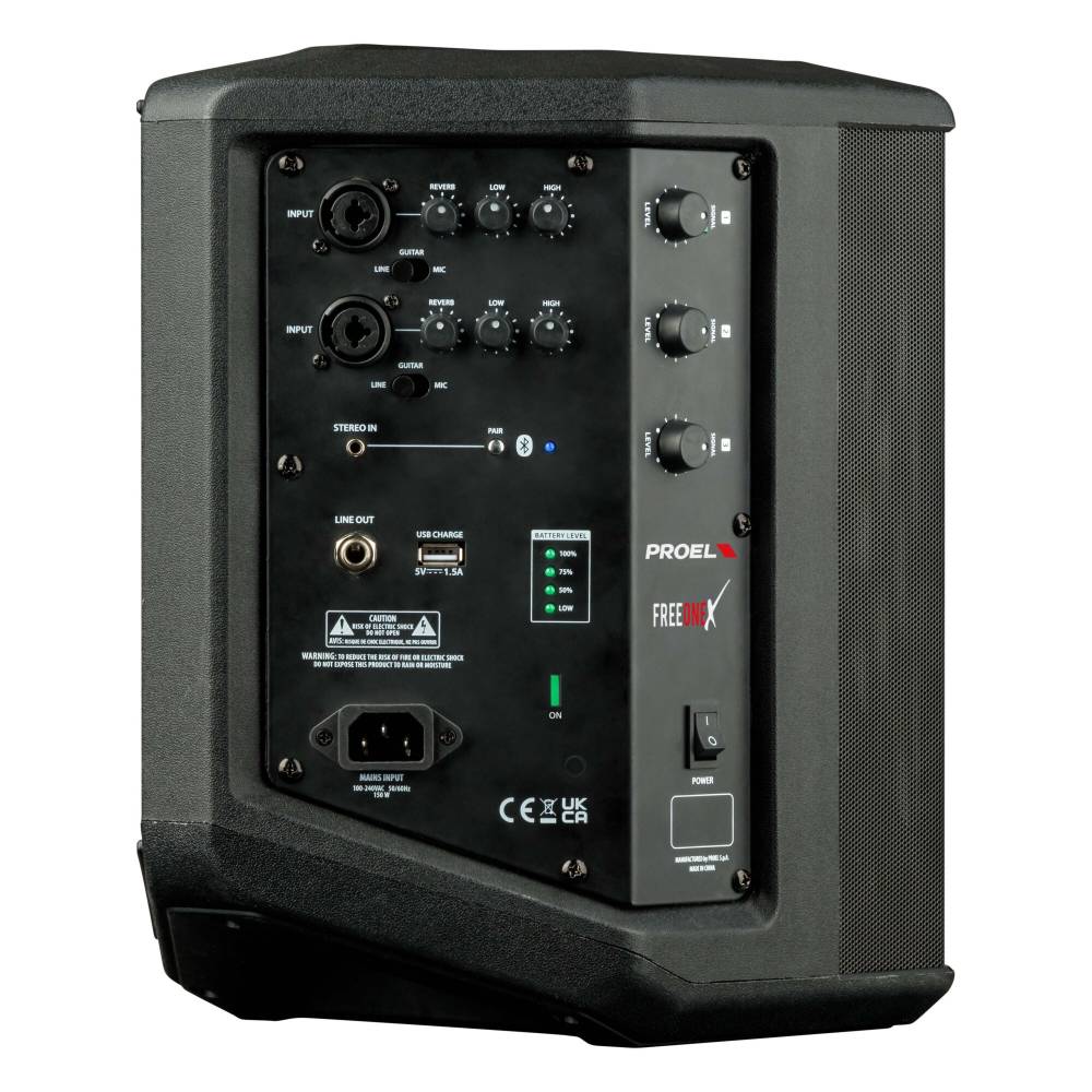 | FREEONEX è un sistema PA all-in-one alimentato a batteria con ingressi multipli e connettività BLUETOOTH. Ospitato in un cabinet in polipropilene compatto, leggero ma ultra-resistente con molteplici posizioni di puntamento, rappresenta la soluzione perfetta per musicisti, DJ e utenti PA in generale. Un array di tre altoparlanti HF da 2″ ad alta definizione accoppiati con un potente woofer LF da 6″ fornisce un suono bilanciato e coerente, un elevato livello di uscita a distanza ed un’ampia copertura di pubblico. L’elettronica all’avanguardia comprende una sofisticata sezione di preamplificazione con processore DSP e un potente amplificatore di potenza in Classe D da 150W + 50W. Il mixer digitale integrato a 2 canali mono + 1 canale stereo consente di collegare due microfoni o strumenti e un lettore stereo, ciascuno con controlli di livello indipendenti. Per gli ingressi microfono/strumento sono disponibili anche un equalizzatore a 2 bande e un riverbero digitale studio-grade. La connessione BLUETOOTH integrata consente lo streaming audio di alta qualità da dispositivi portatili senza la necessità di alcun cavo. La batteria agli ioni di litio integrata garantisce fino a 10 ore di funzionamento continuo senza alimentazione di rete, per la massima libertà di utilizzo. |