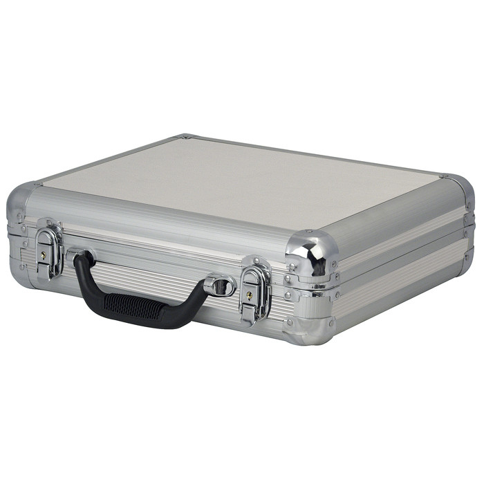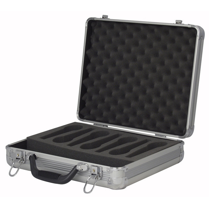 Flightcase per 7 microfoni, con schiuma preformata e spazio aggiuntivo per gli accessori.