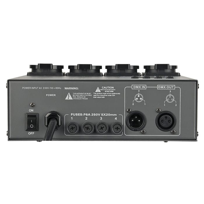 Ogni canale supporta fino a 10 A, con una capacità complessiva di 16 A. L’unità è dotata di prese di uscita Schuko, ingressi/uscite DMX e comandi manuali per ogni canale. Grazie al suo design robusto e alla semplicità operativa, è ideale per service, teatri, club ed eventi live.